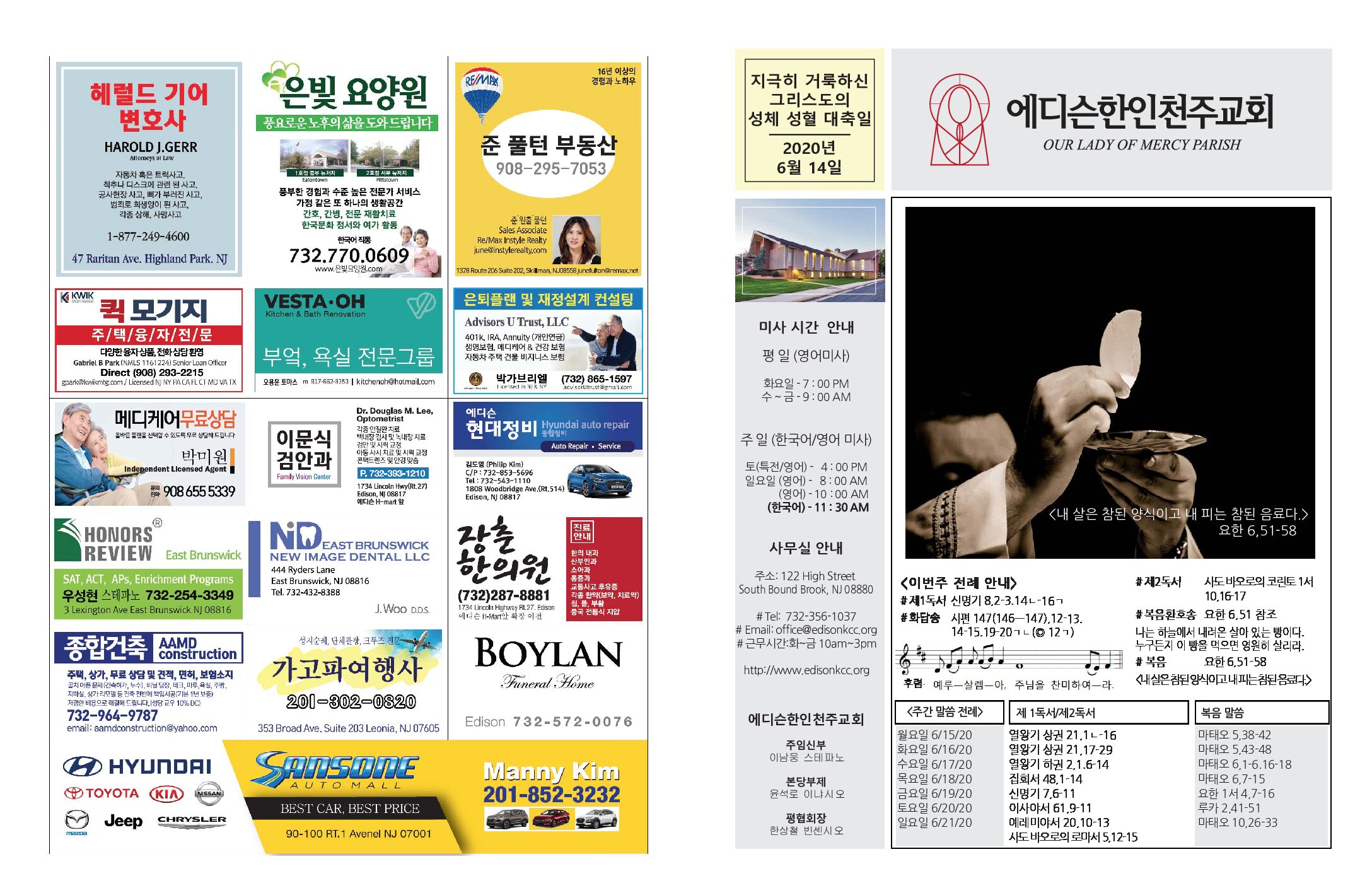 강론 [영상] 에디슨 한인성당 지극히 거룩하신 삼위일체 대축일 (6/7/20) 미사 / 06/06/2020 / No Comments 이번 주일 미사후 공지사항에는 특히 우리 본당의 미사재개에 대한 안내말씀이 들어있습니다. 또한…